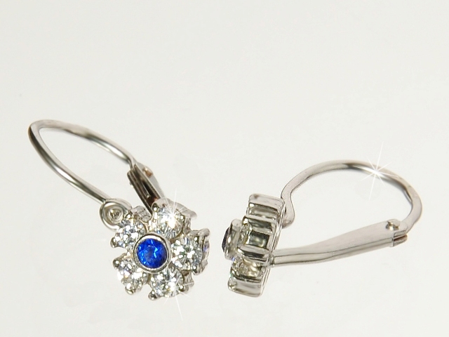 Dětské náušnice ve tvaru kytičky vyrobené z bílého zlata s bílými syntetickými zirkony a modrým safírem uprostřed. Náušnice jsou české výroby s jednoduchým dětským zapínáním (náušnice lze ohnutím drátku v zapínacím očku tzv. zamknout, aby nedošlo ke ztrátě). Výška 12mm, šířka ozdobné části s kamínky 6mm Cena za jeden pár. VHODNÉ PRO VĚK: 0 - 4 roky. Záleží na velikosti ouška a výšce vpichu pro náušničku. (Doporučujeme změřit výšku vpichu pro náušničku).