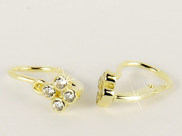 Zlaté náušnice určené pro holčičky, jsou vytvořeny ze žlutého zlata (14karátů). Jemné čtyřlístky zdobí bílé syntetické kamínky (zirkon). Mají jednoduché dětské zapínání. Jejich výška je 12mm a šířka 5mm. Doporučujeme změřit vzdálenost mezi dírkou a ušním lalůčkem, tak lépe odhadnete, jakou výšku náušnice zvolit. Cena je za pár.