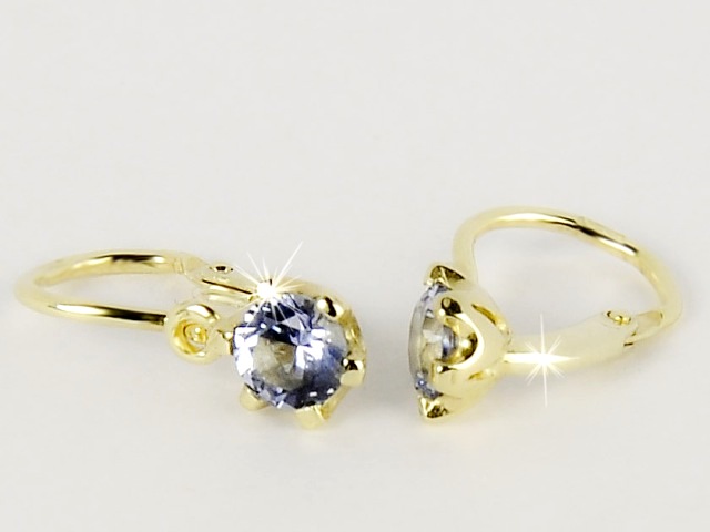 Zlaté náušnice určené pro holčičky, jsou vytvořeny ze žlutého zlata (14karátů). Zdobí je jediný světle modrý syntetický kamínek (safír). Mají jednoduché dětské zapínání. Jejich výška je 14mm a šířka 5mm. Doporučujeme změřit vzdálenost mezi dírkou a ušním lalůčkem, tak lépe odhadnete, jakou výšku náušnice zvolit. Cena je za pár.