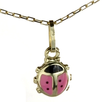 Přívěsek ze žlutého zlata ve tvaru berušky dozdobený smaltem v barvě růžové.