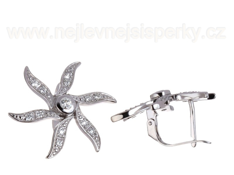 Diamantové náušnice ve tvaru květiny, osázené drobnými diamanty v jednotlivých paprscích a jedním větším ve středu květu