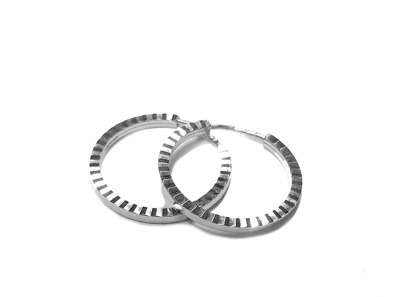 Zlaté kruhové náušnice o průměru 17 mm. Zdobené na obou bočních stranách broušením.