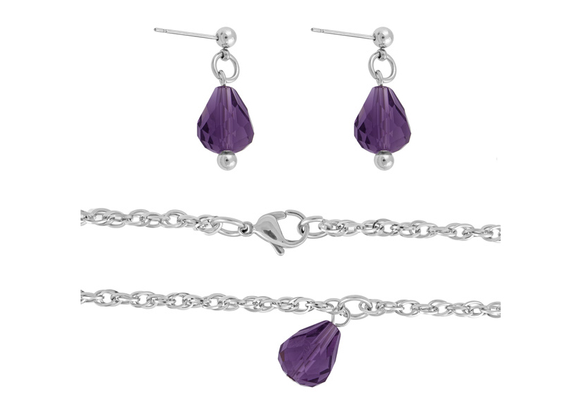 Jemný náhrdelník s broušenou fialovou korákou doplněný jednoduchými náušnicemi. Délka náhrdelníku je 50 cm.