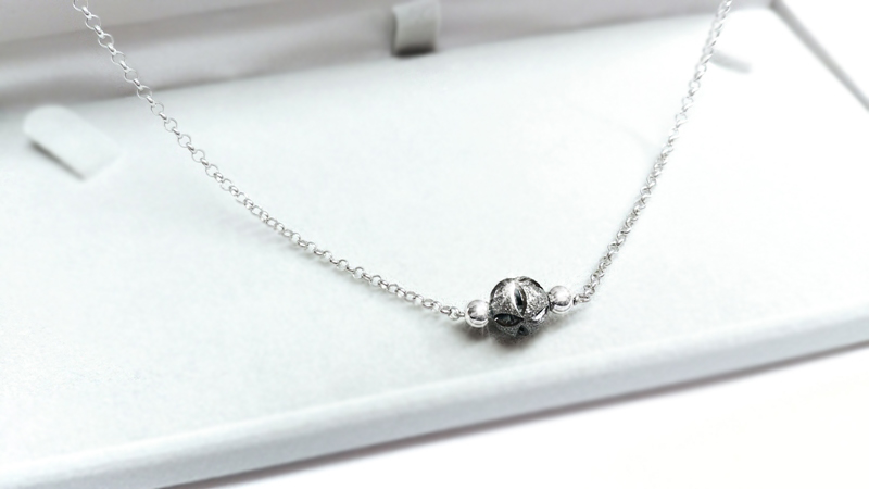 Moderní náhrdelník špičkového designu s povrchově upravenou kuličkou, která má ze všech stran prořez v podobě čtyřlístku a mačkaný černý povrch do drobných šupin pro dokonalý lesk