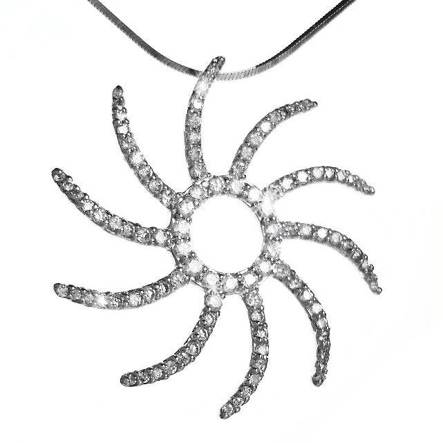 Stříbrný přívěsek se syntetickými kameny ve tvaru slunce.