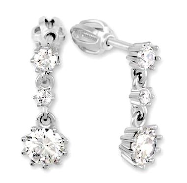 Zlaté dámské náušnice - visací na šroubek z bílého zlata, osazené bílými zirkony do krapen.
