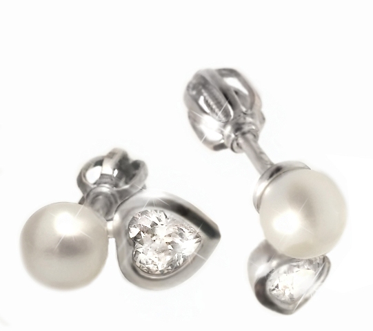Zlaté dámské náušnice na šroubek ve tvaru malého srdíčka z bílého zlata a zirkonem, doplněné říční perlou.