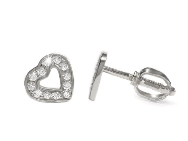 Zlaté dámské náušnice na šroubek ve tvaru srdíčka z bílého zlata, osázené zirkony.