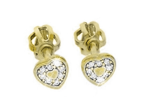 Zlaté náušnice na šroubek ve tvaru malého srdíčka ze žlutého zlata, osázené bílými zirkony.