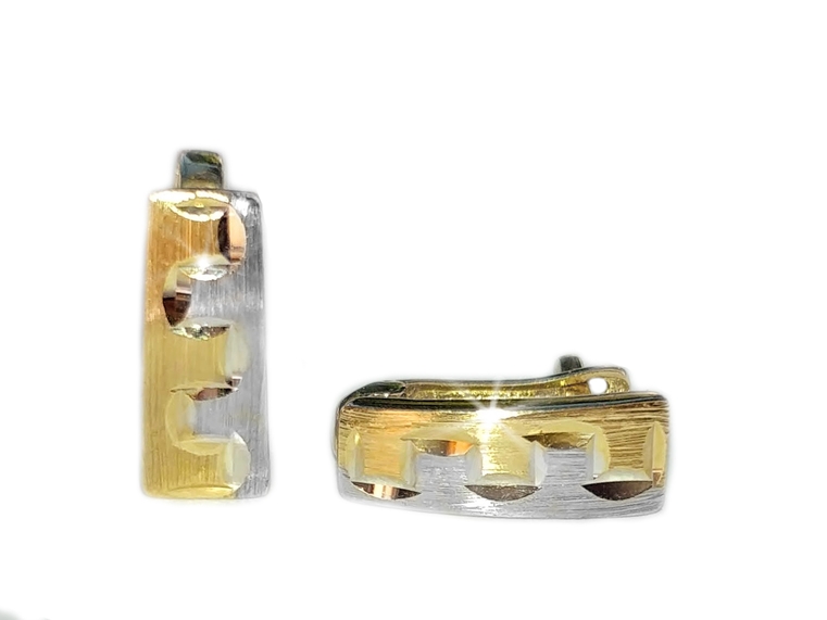 Zlaté moderní náušnice v kombinaci barev žluté, bílé s řeckým vzorem