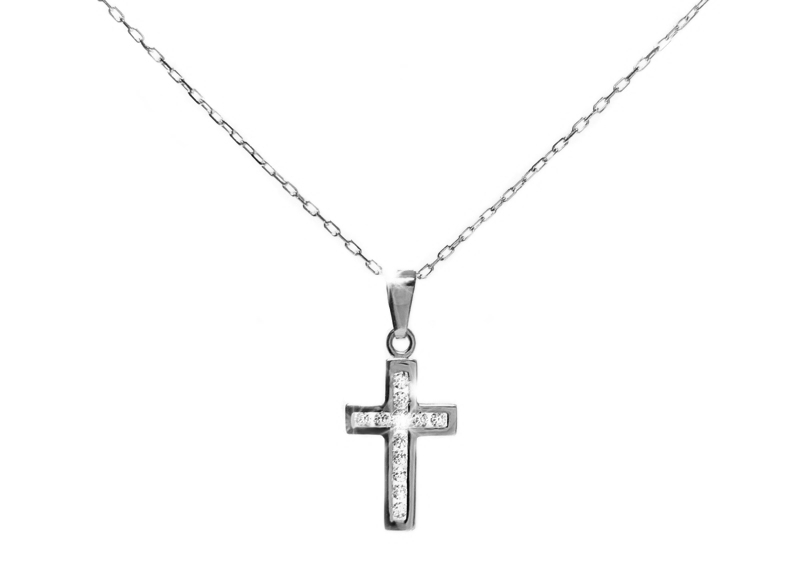 Zlatý přívěsek křížek, osazený jedním středovým výběrovým zirkonem průměr 2mm a dalšími 11 menšími, průměr 1,5mm, které zajišťují dokonalý lesk.