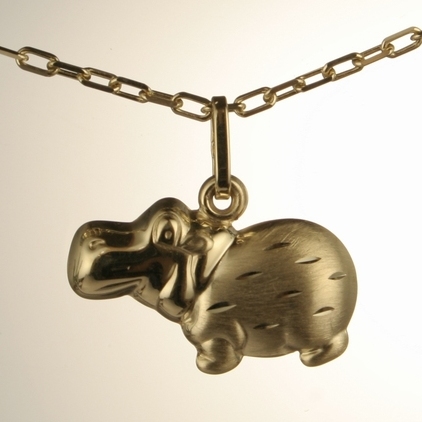 Přívěsek ze žlutého zlata ve tvaru hrocha s povrchovou úpravou na jedné straně, druhá strana lesk. Rozměry v/š 11 x 16mm (měřeno bez závěsného očka).