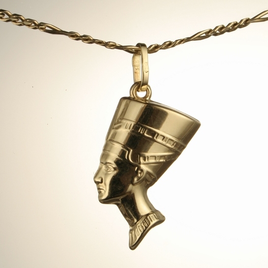 Přívěsek ze žlutého zlata ve tvaru egyptské královny Nefertiti - oboustranná. Rozměry v/š 19 x 14mm (měřeno bez závěsného očka).