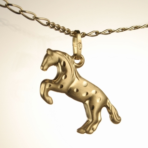 Přívěsek ze žlutého zlata ve tvaru koně s povrchovou úpravou na jedné straně, druhá strana lesk. Rozměry v/š 12 x 20mm (měřeno bez závěsného očka).