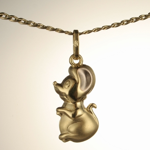Přívěsek v kombinaci žlutého a bílého zlata ve tvaru myšky - oboustranná. Rozměry v/š 16 x 8mm (měřeno bez závěsného očka).