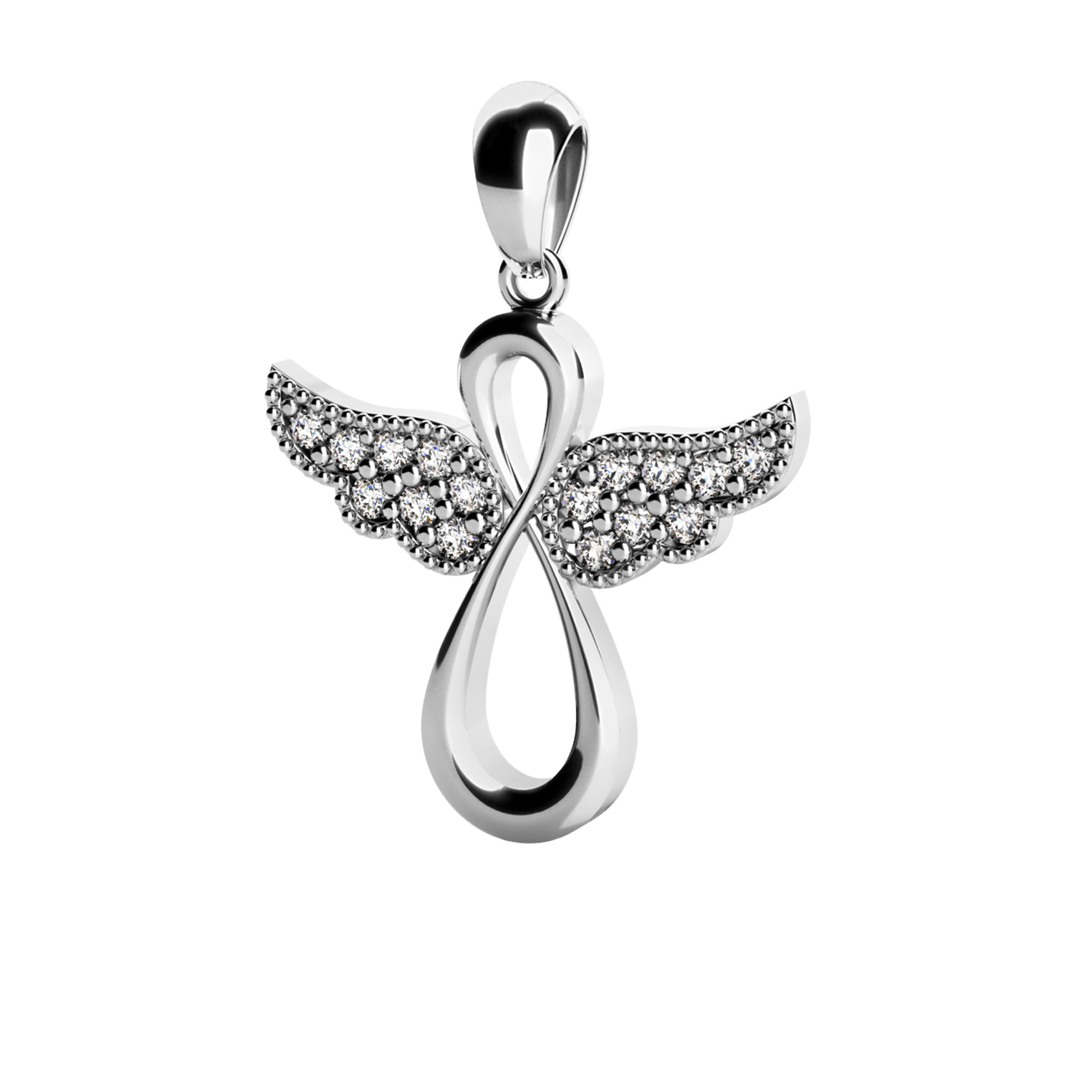 Klasický motiv v moderním pojetí – Přívěsek z bílého zlata v sobě spojuje nebeský motiv anděla a nekonečna. Moderní a přesto velmi jemný šperk, který pohladí duši. Zářivé zikony dodávájí šperku na eleganci
