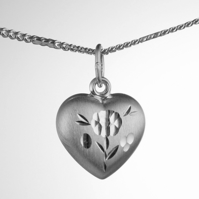 Přívěsek z bílého zlata ve tvaru srdce s povrchovou úpravou na jedné straně, druhá strana lesk. Rozměry v/š 10 x 11mm (měřeno bez závěsného očka).