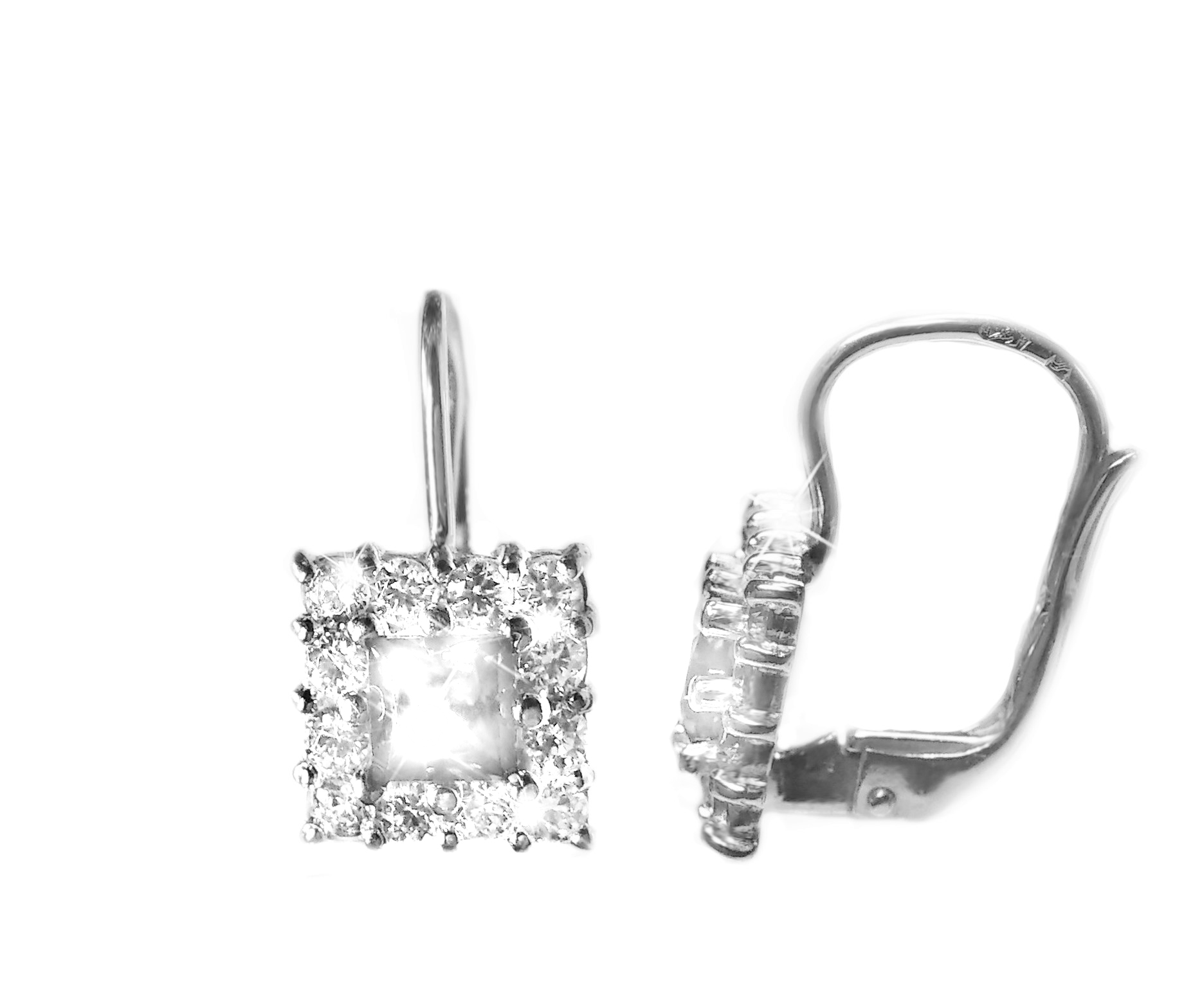 Moderní dámské náušnice z bílého zlata ve tvaru čverce, posázené zirkony s jedním velkým středovým.